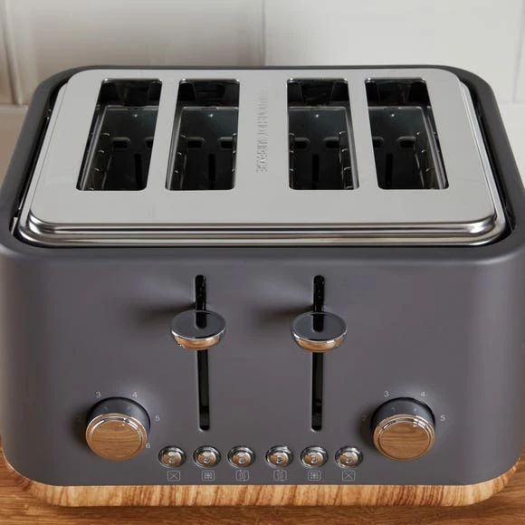 Designed in a modern matt grey colourway, this contemporary 4 slice toaster offers 1750W power output with variable width bread slots with centering guides suitable for the whole family. With Lift & Look function for added convenience, this 4 slice toaster features defrost functions for frozen bread, reheat functions for bread already toasted and mid cycle cancel functions.