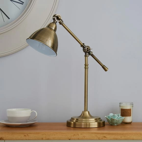 Add a touch of class to your interior with our antique brass lever arm table lamp. Featuring a handy lever that enables you to adjust the height of the lamp, it offers a sleek and modern design. Perfect for adding practical lighting to your office or living space, it will suit a host of interiors.