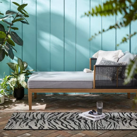 Walk on the wild side with our Saber Tiger Print Runner. In a Polypropylene blend the Saber Tiger Runner is weatherproof and hard-wearing, so you can take your wild style outdoors. The Saber Tiger runner pairs a muted monochrome palette with a large-scale tiger-print, adding a luxe feel to any space. We love using the Saber Tiger Runner to inject some wild style to hallways and patios.