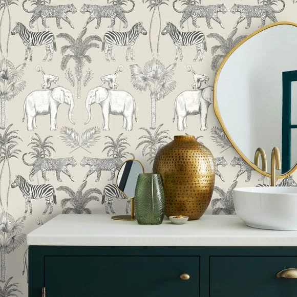 This gorgeous wallpaper features a safari-inspired design, showcasing elephants, zebras, and more. Easily apply this wallpaper by pasting the paper!