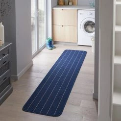 Choose the Practimat Theo Stripe runner, doormat and rug to add some comfort to your busy space. Available in a range of dark colours, paired with a smart pinstripe effect, the 100% polypropylene machine washable composition is perfect for keeping your space fresh and clean. Ready for any spills or dirt the Practimat Theo Stripe range is pet and child friendly. We love using the Theo Stripe by doors to catch muddy prints and in kitchens and bathrooms to add a layer of comfort to hard-floors. The slip resistant backing is ideal for keeping the rug in place.