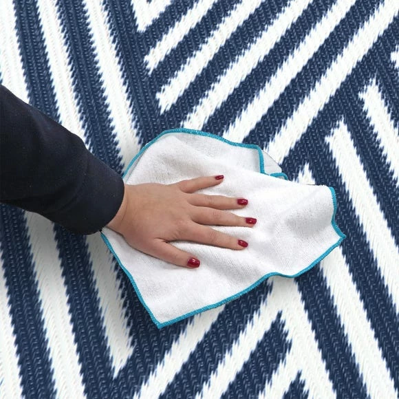 Do you like swapping up your style every so often? This JVL rug is perfect as it has two styles in one! The geometric print in navy blue and white creates an eye-catching design, a great addition both inside or outside the home adding practicality and style to any space. This stylish rug features a flat woven pile constructed of 100% polypropylene meaning its hard wearing and durable. Not only is this rug made to withstand rain and sun, but it is also lightweight and can be rolled up for easy storage. It would look great on your decking, patio or balcony areas. Can be used to sit on or many people opt to have the mat under the front of furniture or tables. Multi-use: the mats can be taken to the beach, park or with you on picnics, ideal for taking on holidays too; camping or caravanning.